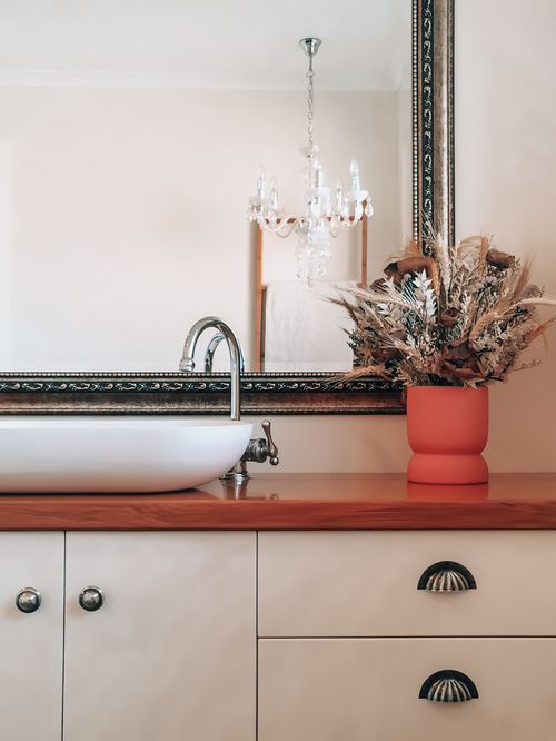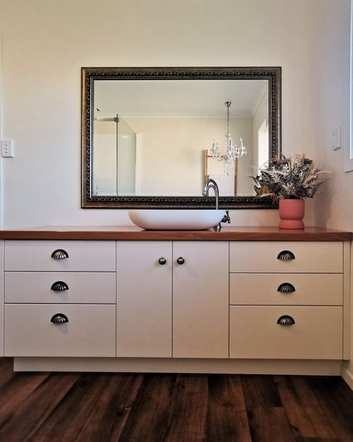 Continuing with the farmhouse style for a cohesive flow, these bathrooms beautifully house polished rimu benches. Authentically handcrafted, a plinth supports the tapware giving it height to be in proportion to the porcelain basin. Styled with oversized decorative mirrors; reflecting elegance to balance rural living.