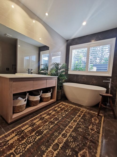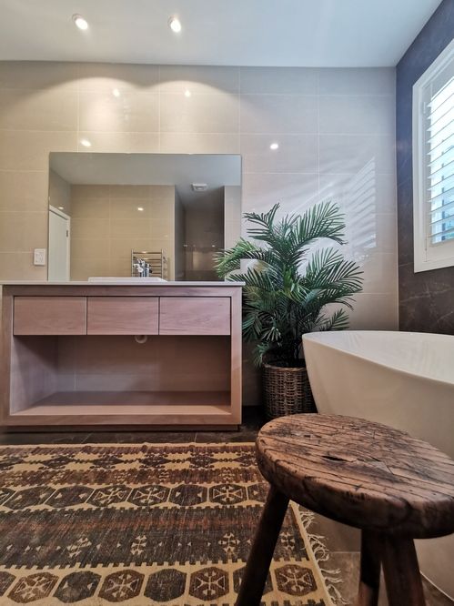 This moody bathroom sets the scene to relax and restore. Highlighting the bespoke ash wood vanity featuring three drawers, a void for storage and white bench with inset porcelain basin.
