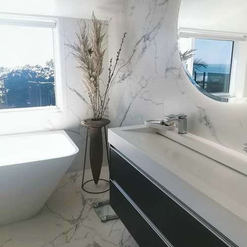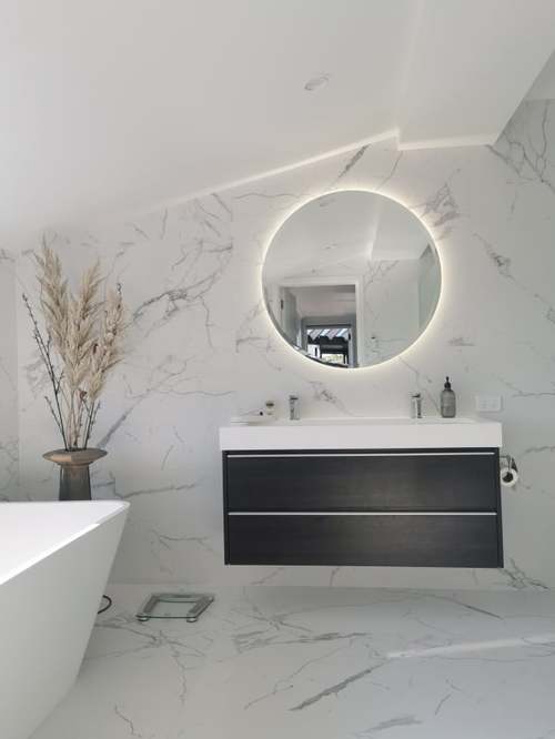 Modern-luxe retreat, styled with the effortlessly elegant monolith floating vanity; the essence of beauty in the bathroom.