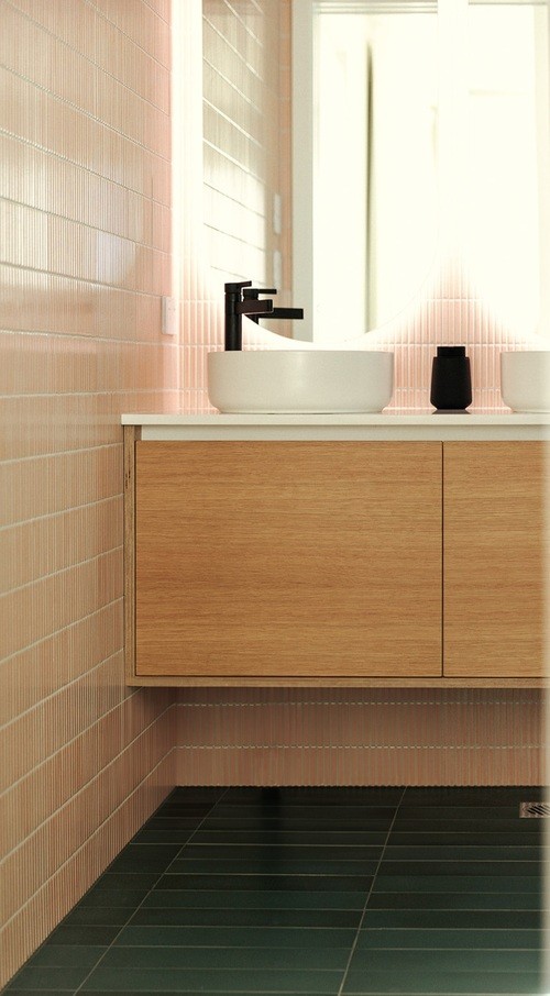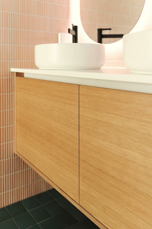 Artisan wooden ply hanging wall vanity featuring deep double drawers with his and hers on-bench round porcelain basins, set with backlit circular mirrors on a subtle pink hued finger tiled room.