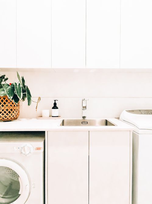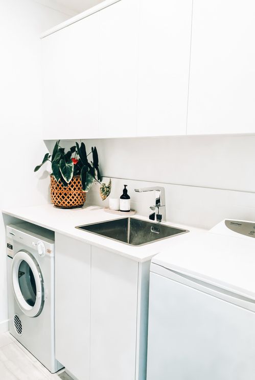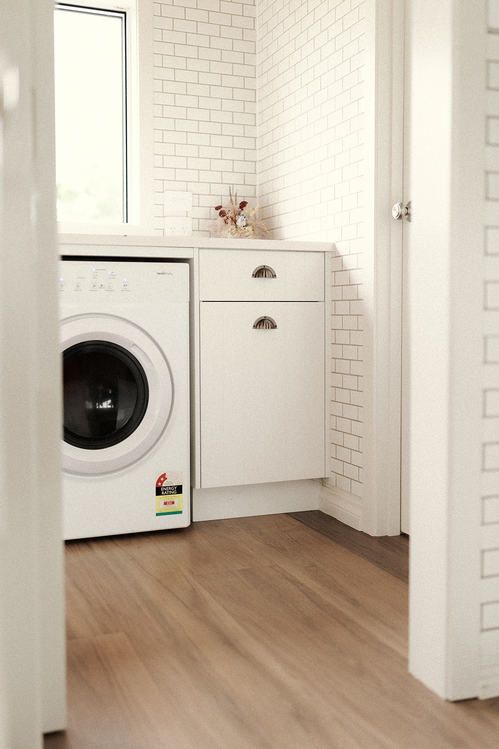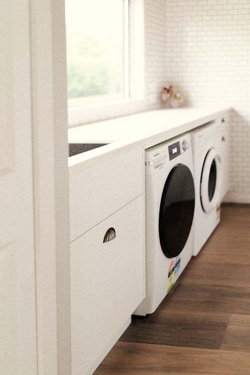 Timeless white laundry with hidden handles, easy to keep clean and organised with plenty of storage.